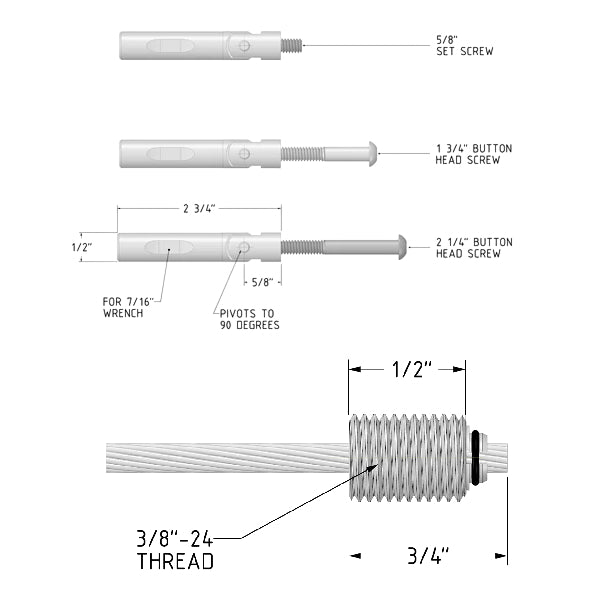 - .625" Set Screw: For posts with a pre-tapped (threaded) 1/4-20 hole. This option is ideal for corner posts where multiple cables need to attach.